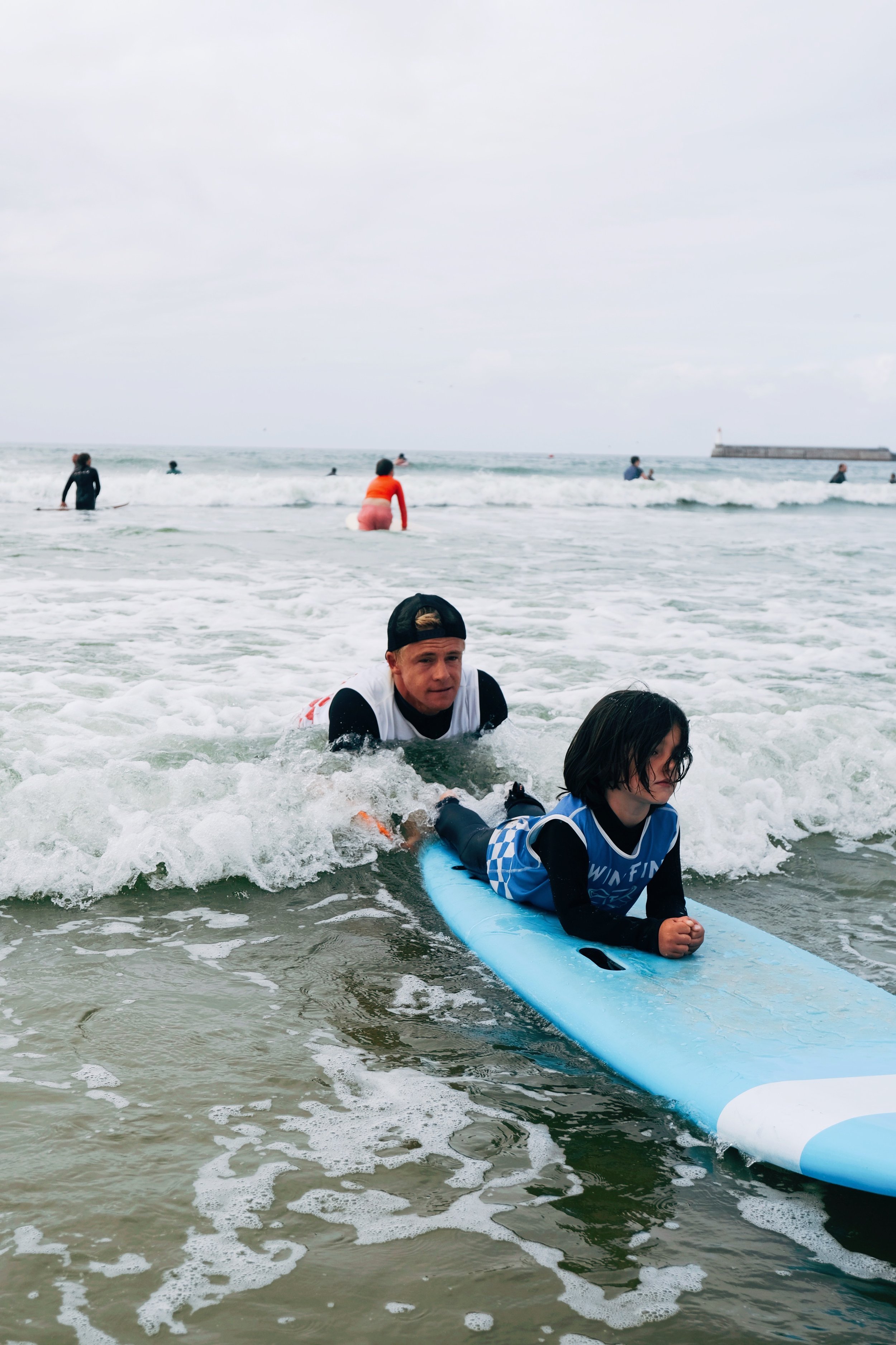 Équipés d’une planche et d’une combinaison adaptée à leur gabarit, ils vont découvrir les premières sensations de glisse sur une planche de surf.